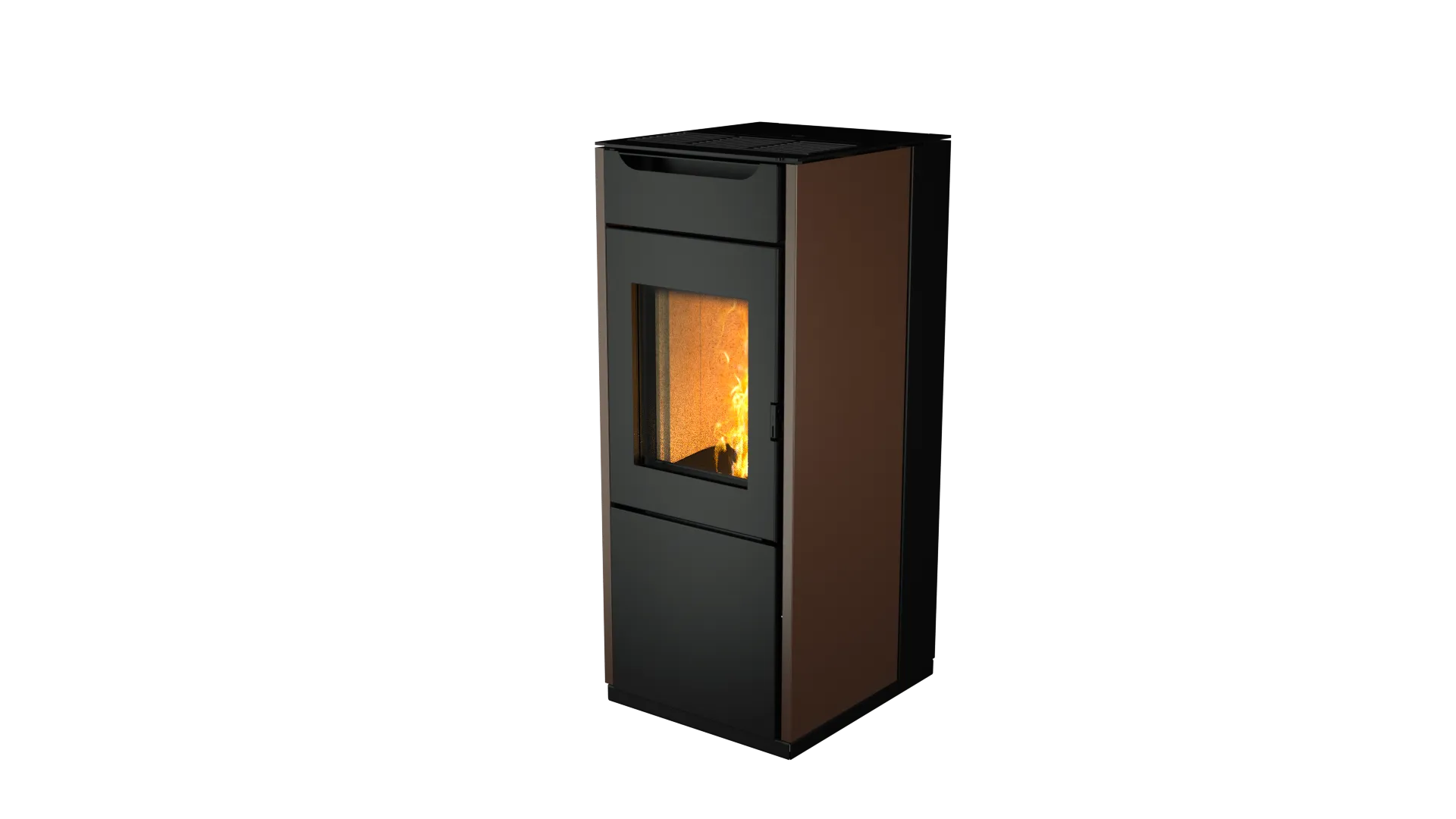 Poêle à granulés à air, dessus en fonte, revêtement en acier peint, belle vue sur la flamme, vitrocéramique résistante à 800°C, grand tiroir à cendres, système de nettoyage automatique du brasier, avec une ventilation frontale standarde et excluable, un conduit arrière (uniquement sur A8C Quadra), fonctionnement par convection naturelle à n’importe quelle puissance, logiciel standard elemento.